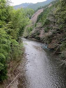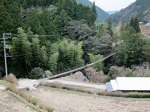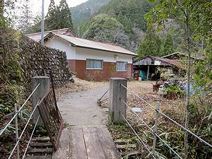 | 橋から南側(上流側)の眺め。写真左岸(県道側)は竹林です。 | ここも橋を渡ると民家(たぶん現役)が1軒だけありました。この家専用の吊り橋と化しているようです。外れてましたが、親柱のところに門扉がありました。 | 対岸側から | ||