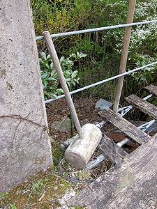 | 今西の吊橋から500mほど上流に進むと、県道から斜面が広がって見え、その下方に吊り橋が見えます。 | 親柱間にメインケーブルを通してあるタイプの生活橋です。一番上の写真でもわかるように、真ん中あたりに支柱(木製)があります。でも、しっかり固定されておらず、グラグラでした(汗) | 親柱の横に、打ち出の小づちが…でなく、この木槌でたたいて確認してから橋を渡りましょう!ということでしょうか(笑) | ||