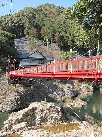 | 湯谷(ゆや)温泉のある国道151号から湯谷大橋を渡ると、鳳来寺山パークウェイ入口があり、そのすぐ近くに馬背岩(うまのせいわ)入口と書かれた看板があります。そこから歩道橋でJR飯田線を渡ると、蓬來薬師如来があり、階段を下りていくと吊り橋があります。 | 温泉街に似合う赤い吊り橋です。ベンチも置かれています。 | 橋はしっかりした造りなので揺れません。 | ||